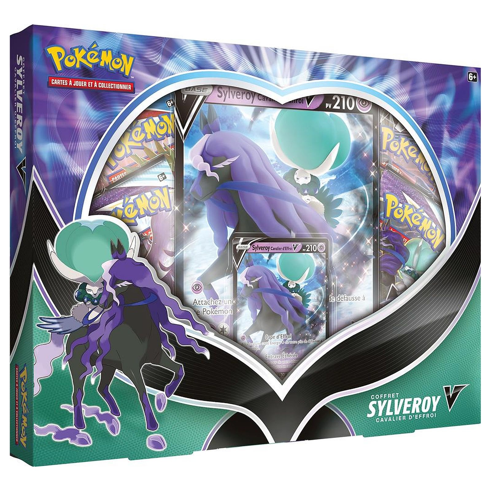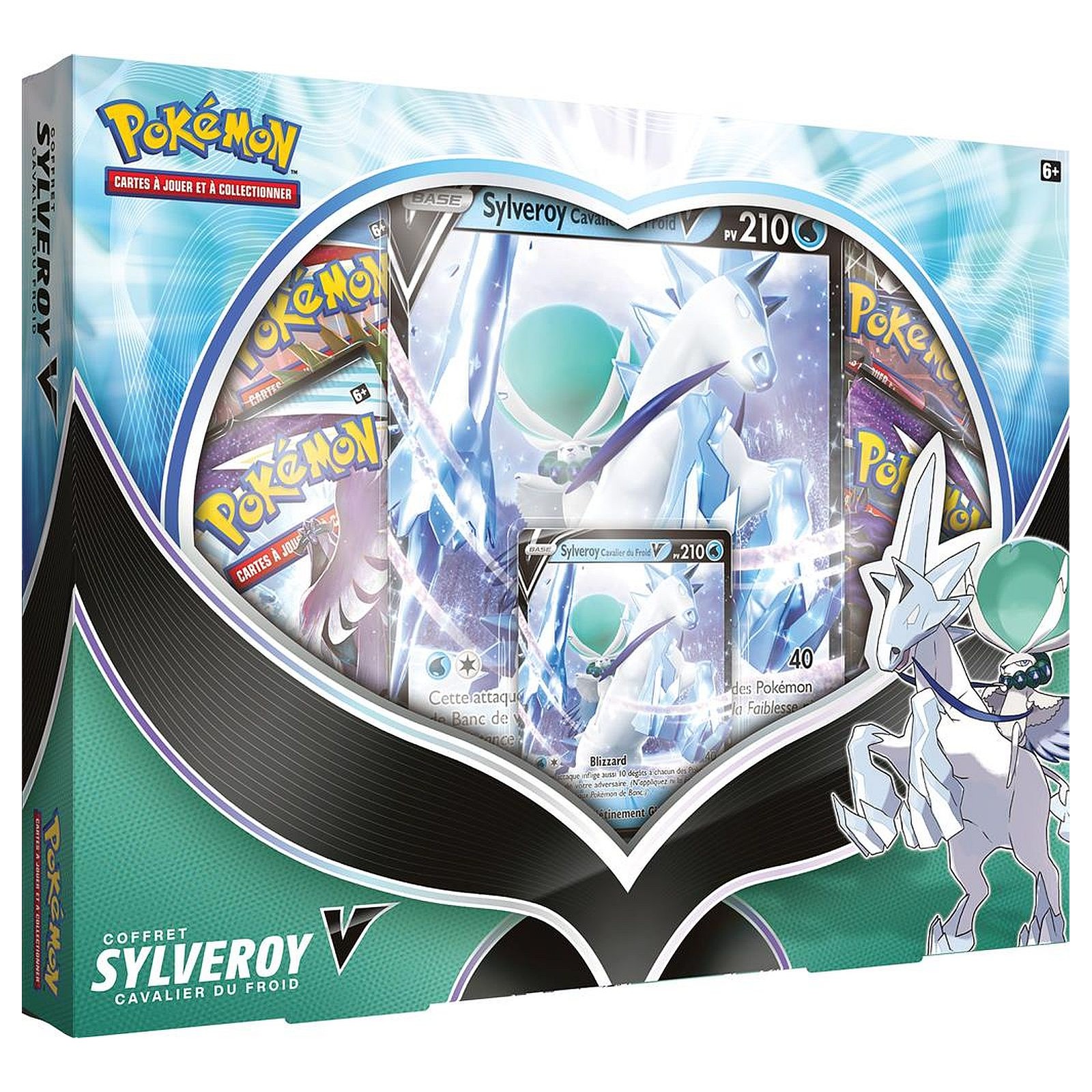 Le coffret Sylveroy contient une carte promo en format normal et une en format Jumbo (Sylveroy Cavalier du Froid-V ou Sylveroy Cavalier d’Effroi-V), 4 boosters du JCC Pokémon et une carte à code pour le JCC Pokémon Online.